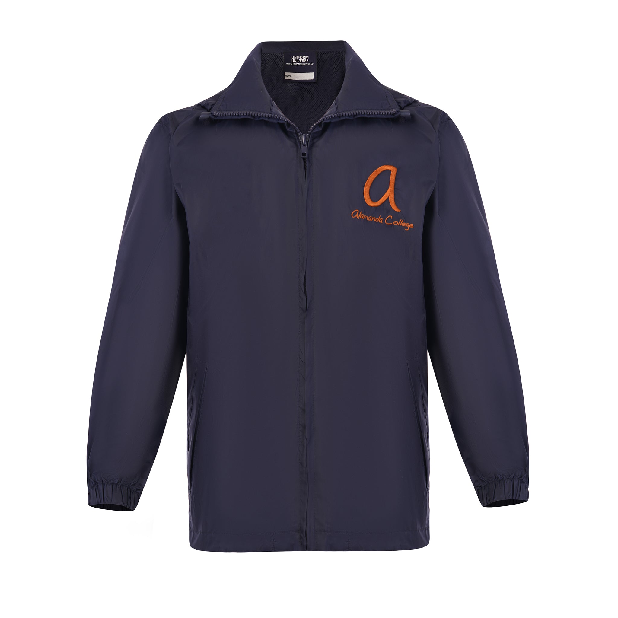 The sleek design features a full-length zip for easy wear, elasticated cuffs to keep water out, and a high collar for added protection. The embroidered Alamanda College logo on the chest adds a touch of school pride, making it a smart addition to the uniform.